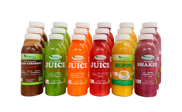 Kuren indeholder 18 koldpressede økologiske produkter. Du drikker 6 flasker om dagen, fordelt på juice, nøddedrikke, supper og shots.